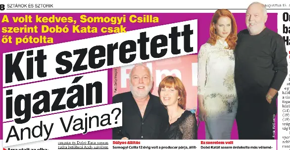 Csak kevesen, főleg a szakmabeliek tudták, hogy az utóbbi másfél évben újra nagyon szoros kapcsolat volt dobó kata és andy vajna között. Mély kapcsolat volt dobó kata és andy vajna között, a színésznő elárulta, nagyon sok lelki támogatást kapott volt párjától még a szakításuk után is. Dobó kata vallomása andy vajnáról: Jótékonykodik, számos felkérésnek is eleget tesz. Dobó kata egy orosz milliárdost szeretni már több, mint négy hónapja.